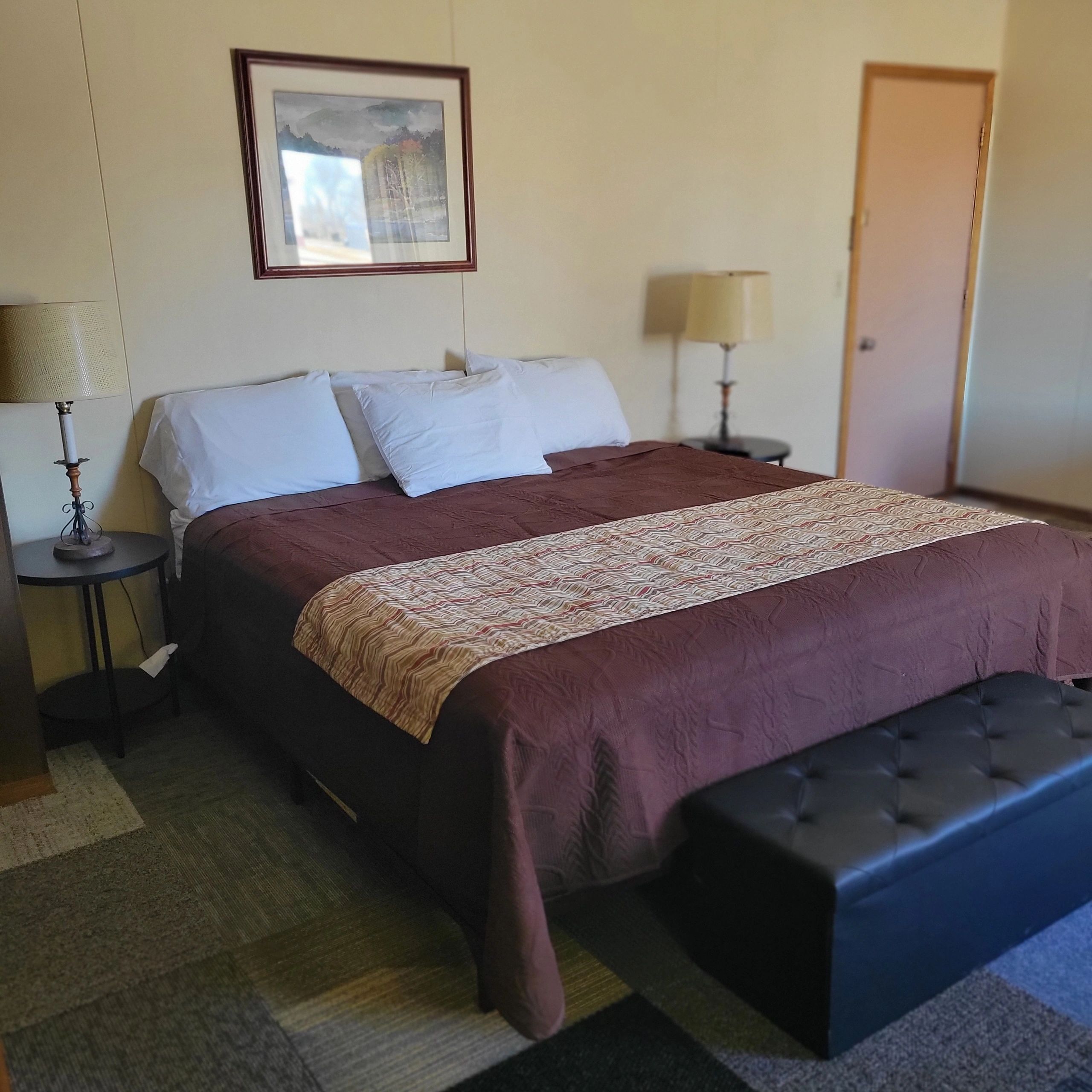1 King Bed in extra-large room perfect for lounging, bathtub/Shower, 32" Smart TV, in room single serve coffee maker, mini fridge, fresh linens, shampoo, conditioner, bodywash, complimentary wi-fi.